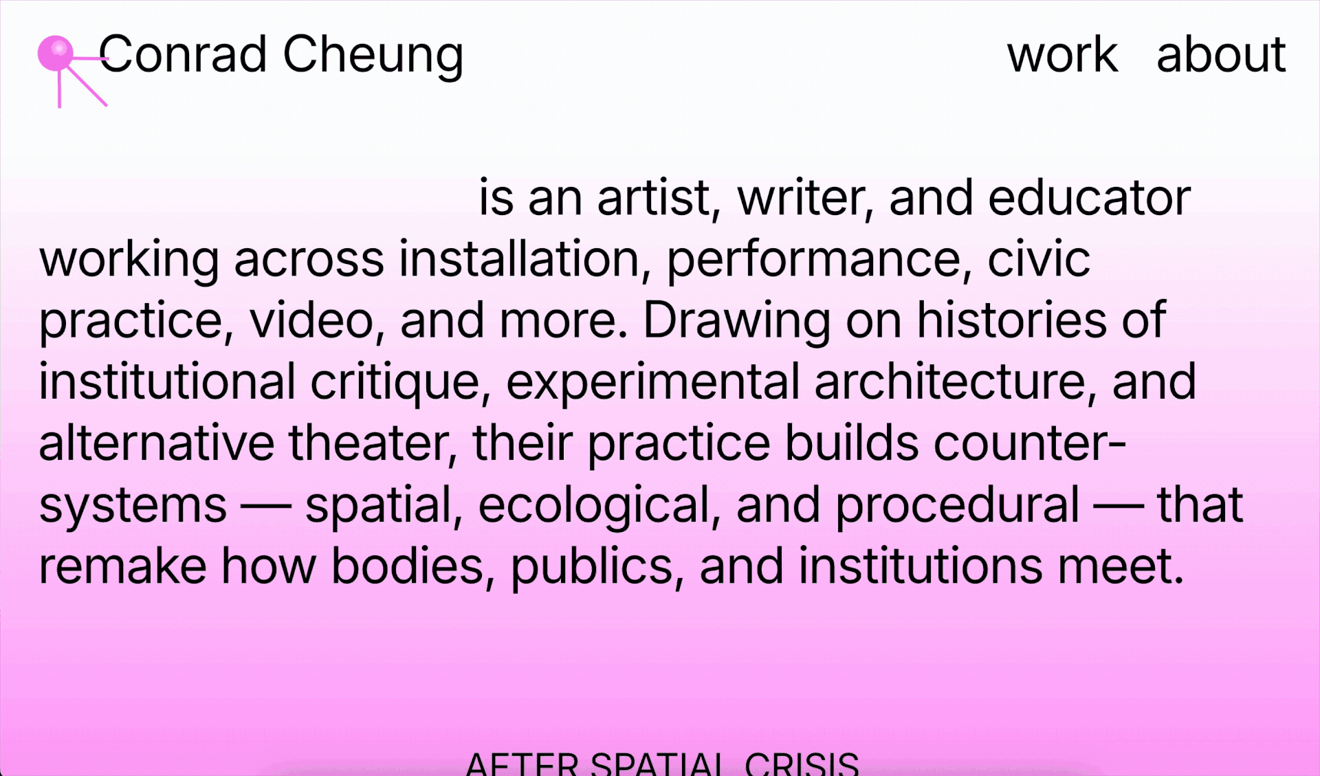 Conrad Cheung's work positions historical contexts alongside contemporary experiences. With this juxtaposition in mind, we developed a website that not only embodies this tension, but explores color, queerness, and ideas of censorship.