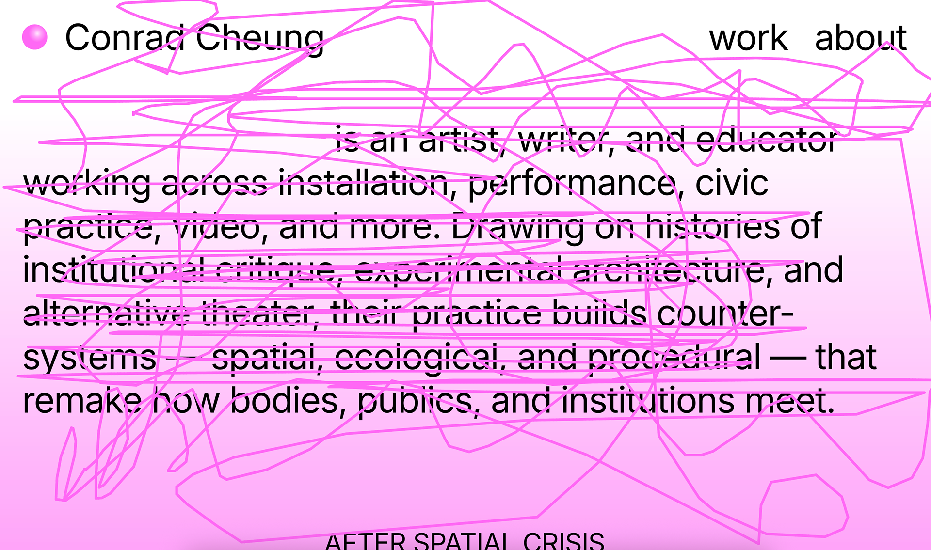 Conrad's work is complex, historical, referential, observational, and ironic. I wanted to create a website that exemplified Conrad as an artist, while serving as a backdrop for their work.