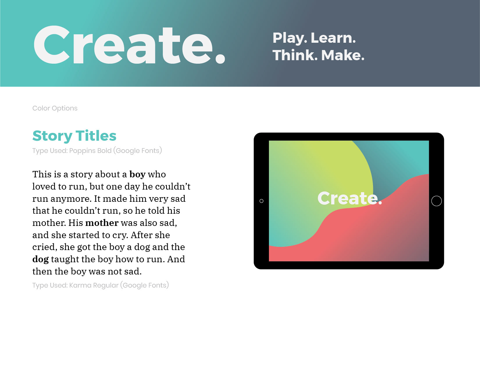 While conducting research, our team discovered that our target audience (ages 8-11), tends to spend their time during both structured and unstructured play. We designed the app with these types of play in mind, and asked ourselves "How can an app seem fun, and yet be educational? What does 'childish' design mean, and how can Create be mature and playful?"